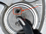 Donc j'enlève le fameux mastic et je trouve un trou par lequel fuit/pisse franchement l'essence. Vu la taille du trou (un fil électrique 2.2mm2 rentre facilement) j'ai du mal à croire qu'il ne soit pas d'origine dans la pièce... j'imagine que la fuite vient de plus haute mais que l'ancien proprio l'a bouchée ici... j'imagine par la même que le témoin de réserve ne doit pas fonctionner...