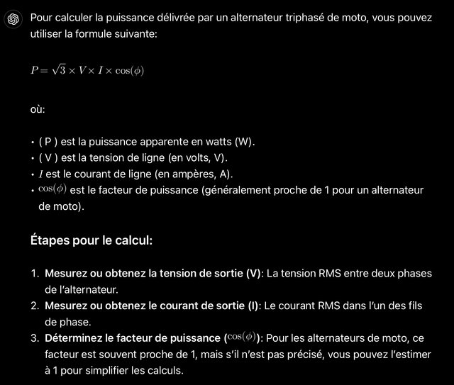 Cela dit, 140v entre les deux phases (fils jaunes) à 6000 tr/min, avant le régulateur, ça fait beaucoup aussi,  (le courant alternatif peut-être dangereux pour l’homme à partir de 50v, il me semble).