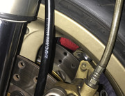 Je me suis ensuite penché sur le renvoi de compteur, avec l’intention de bien le positionner cette fois-ci. En effet, il était trop incliné vers l’arrière, ce qui a conduit à la rupture de l’extrémité inférieure du câble, me privant de vitesse (et de compteur kilométrique). On voit bien le problème sur ces photos. Le renvoi n’est pas en appui sur la petite butée prévue sur la bague de fixation du garde-boue.