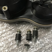 Pour dévisser l’extrémité supérieure du câble, au niveau du compteur, il est préférable de démonter la tête de fourche et le bloc optique avant. On accède ainsi très facilement à l’arrière du bloc à instruments. Et là, en dévissant le câble, je le trouve bien branlant, ce bloc à instruments… Et je me souviens qu’il vibrait un peu trop à mon goût lors de ma dernière virée. En regardant de plus près, sur les 3 silent blocs qui servent à le fixer à l’araignée, un est coupé à ras et les deux autres sont en bonne voie pour subir le même sort à cours terme…