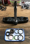 Il ne me reste plus qu’à finir de sortir le roulement inférieur (coriace!), recevoir les roulements et joints neufs (le système de paiement de Stein-Dinse est totalement aux fraises et des commandes qui devraient être traitées en 3 jours prennent des semaines…  :roll: ) et je pourrai boucler l’avant début mai j’espère.