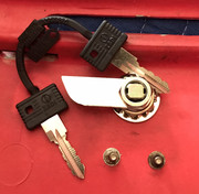 -l’élue: pas de clé (ni de papiers) car restés chez Mme Untel qui devait s’occuper de la mettre aux enchères, patati patata… Bref, j’ai récupéré tout ça hier et j’ai juste la clé de contact. Rien pour la selle. En observant l’autre selle, je trouve rapidement un moyen de l’ouvrir sans clé et hop, le tour est joué. En attendant, j’avais eu le temps de trouver un ensemble barillet + clé de selle NOS donc remplacement et c’est comme neuf! Du coup, j’ai maintenant deux clés pour cette moto, comme à l’origine.