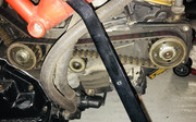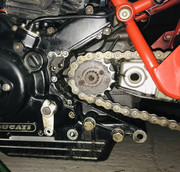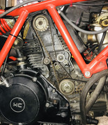 Et démontage des caches-courroies. Sans surprise, c’est plutôt propre la dessous. Encore une fois, sur le plan mécanique, cette moto a été bien entretenue. On voit encore la marque des courroies (Gates) et la référence Ducati inscrite dessus (73710081A). Remplacement à venir!