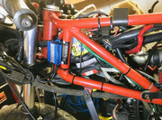 Et cette moto est « littéralement à la masse »! Une broche a été ajoutée juste à côté de la borne « - » de la batterie, et pas moins de 5 tresses en partent pour aller se relier à divers points du moteur et du cadre. C’est aussi moche qu’impressionnant… Cela doit également être efficace, mais au risque de me répéter, je préfère largement les kits d’Exact UK ou MotoElec…