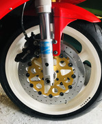 Et devant, les pistons doivent commencer à grimper. Avec le matos neuf, ça freine légèrement en permanence et ça couine. Ça ne chauffe pas outre mesure, mais la moto est très pénible à déplacer moteur coupé. À tel point que je l’ai foutue par terre