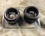 Comparaison des pistons: d’origine, acier creux. En remplacement, alu Téflon. Une différence de poids assez étonnante lorsqu’on les a en main…
