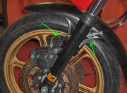Sur ma MHR actuelle qui est une des dernières à cadre SS de 83, les étriers étaient déjà passés derrière les fourreaux mais je vais les rebasculer devant car je préfère l'ancien montage ci-dessus, à celui-ci:
